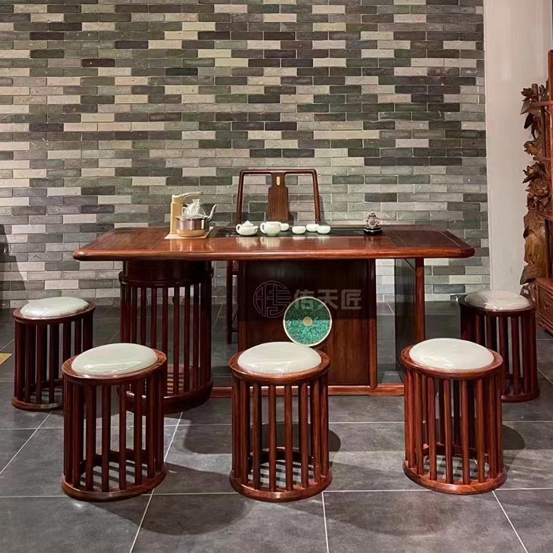 Kinų stiliaus raudonmedžio medienos klasikinis arbatos stalas yra sielos buveinė ir draugystės susibūrimo vieta. Čia išsivirkite puodą kvapnios arbatos ir paragaukite gyvenimo ramybės bei grožio. Perpildytame arbatos kvape pajuskite laiko tėkmę ir mėgaukitės laisvalaikio akimirka. Jis yra kruopščiai pagamintas iš juodmedžio ir yra iš Chuantianjiang Redwood gamyklos. Padarykite gyvenimą skoningesnį, o laiką – poetiškesnį. Arbatos staliukas yra lankstus derinti, o fotelius ir taburetes galima derinti pagal poreikį.