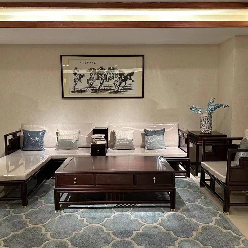 Ši naujojo kiniško stiliaus juodmedžio svetainės sofa yra namų šedevras, įkūnijantis meistriškumą ir estetiką bei atitinkantis naująjį kinų stilių. Tūkstančiams klientų suteikėme kiniško stiliaus viso korpuso pritaikymą, pradedant sudėtinga apdaila + viso namo medinių darbų pritaikymu + viso namo raudonmedžio baldų derinimu + minkštos apdailos derinimu.