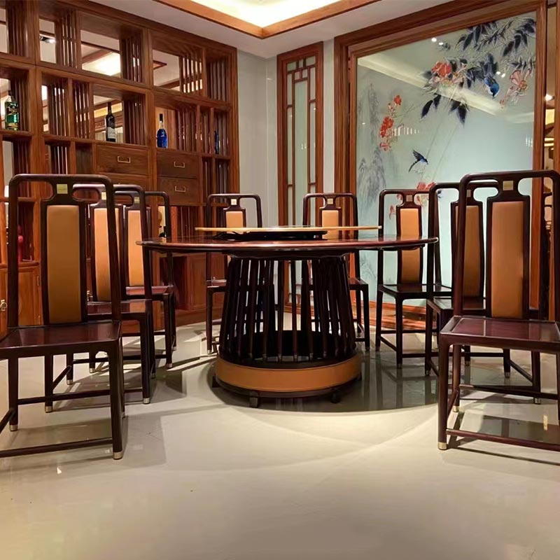 Naujasis kiniško stiliaus raudonmedžio apvalus valgomasis stalas yra ne tik baldas, bet ir gyvenimo būdas, nenumaldomas kokybės ir grožio siekis. Tegul Apvalus stalas tampa spindinčia žvaigžde jūsų gyvenime ir žydi amžinu žavesiu. Jis turi naują kinų stilių ir apima modernius bei paprastus elementus. Oda suteikia unikalų prisilietimą ir vizualinį potyrį, suteikiant apvaliam stalui madingos atmosferos. Pridedami grotelių elementai parodo tradicinės architektūros žavesį ir paverčia apvalų stalą pilnu sluoksnių. Apvalaus stalo stabilumą užtikrina tradicinis įpjovos ir kaištinės konstrukcijos panaudojimo amatas. Įpjovos ir kaiščio konstrukcija paveldėjo senovinį meistriškumą. Jai nereikia jokių vinių ar klijų, bet tvirta kaip uola. Tai tradicinio meistriškumo pagarba ir paveldėjimas bei nuolatinis kokybės laikymasis. Kiekvieno smeigtuko ir smeigtuko tvirtumas yra išradingumo santrauka, parodanti nepaprastą senolių išmintį ir puikų meistriškumą. Naujas kiniško stiliaus rožmedžio apvalus valgomasis stalas – tai išskirtinis kūrinys, parodantis namų erdvės skonį.